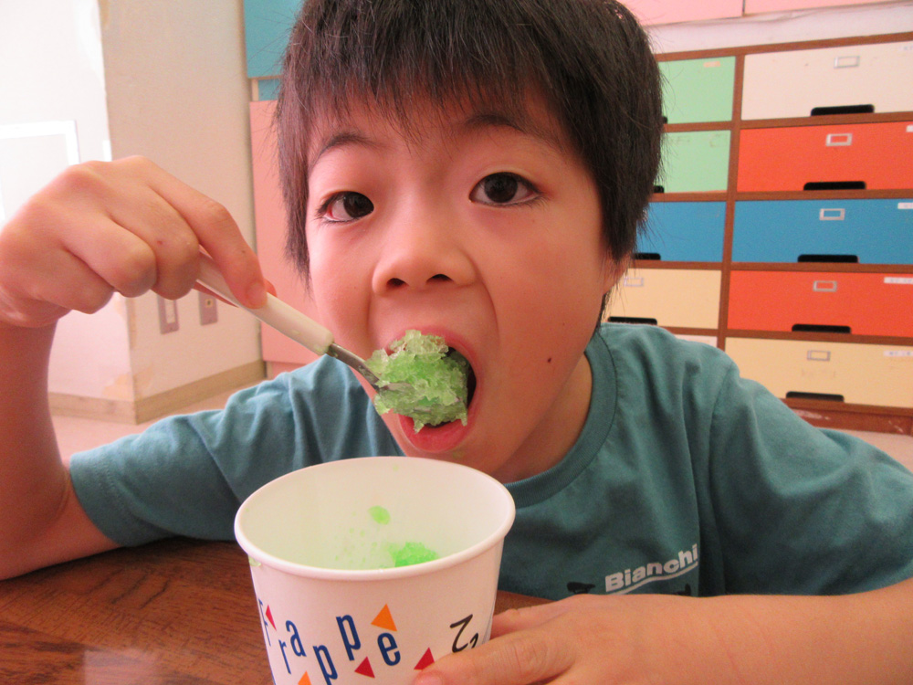 かき氷は好きなシロップをかけて、フルーツや練乳のトッピングをして、暑い毎日のなかで冷た?いおやつを食べて夏を満喫中です。