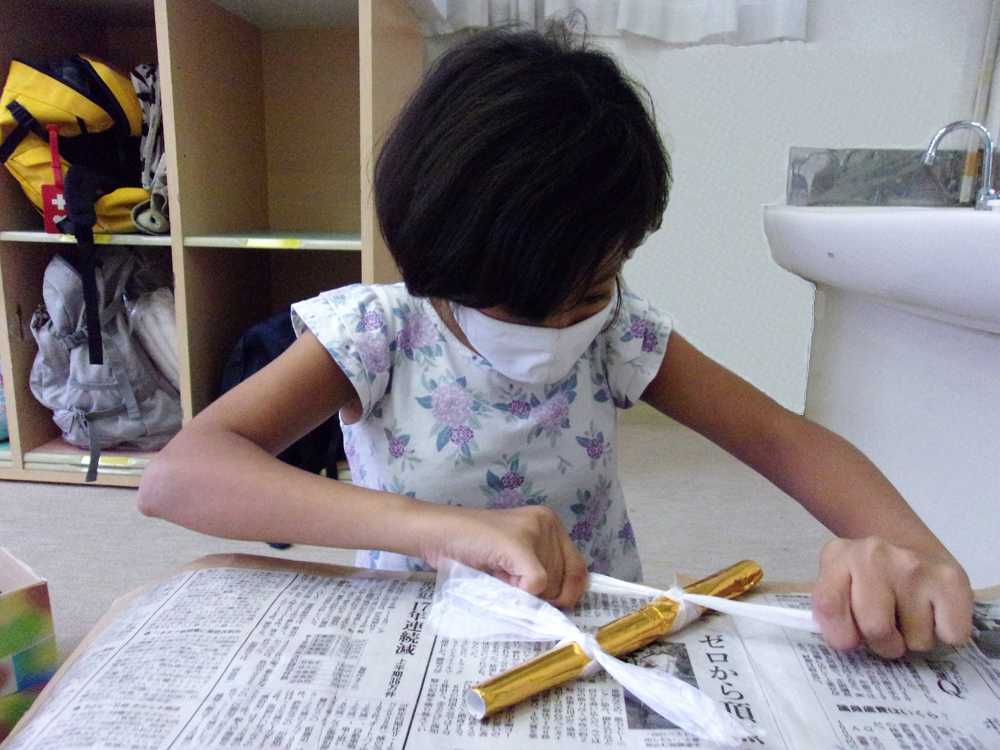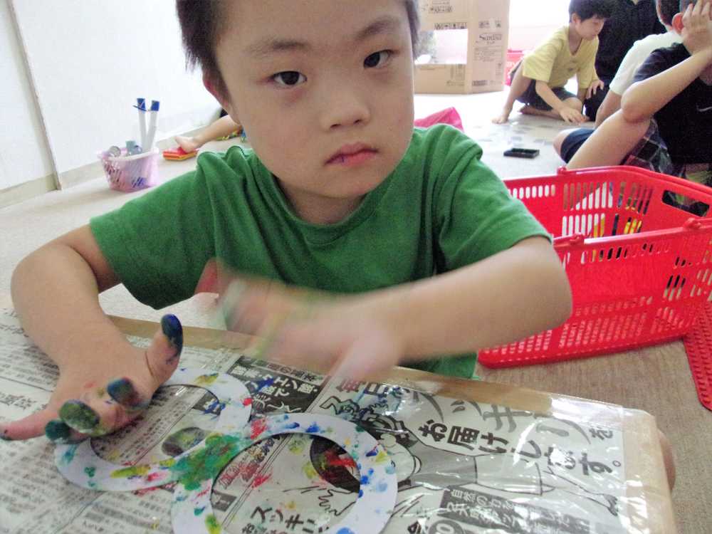 秋の製作として「トンボのめがね」を作りました。指を使って、メガネに絵の具で色を付けました。トンボの胴体はスズランテープを結んで、羽根を作りました。