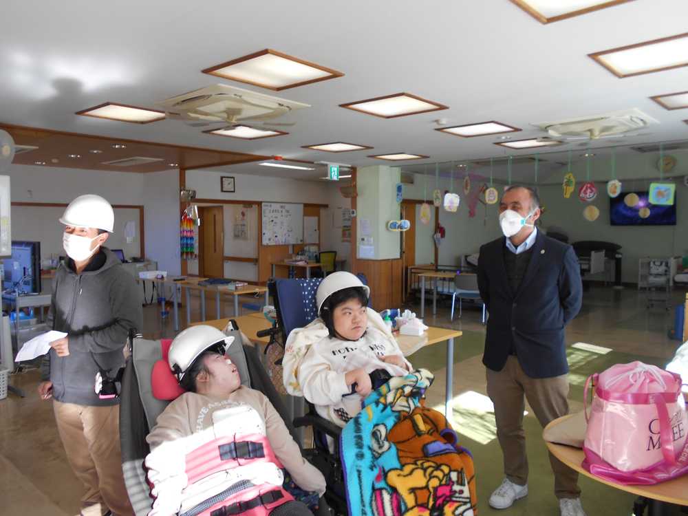「地震が発生しました」利用者さんを避難口まで誘導します。