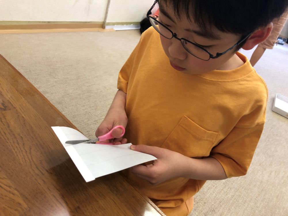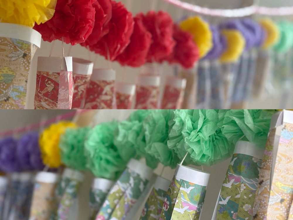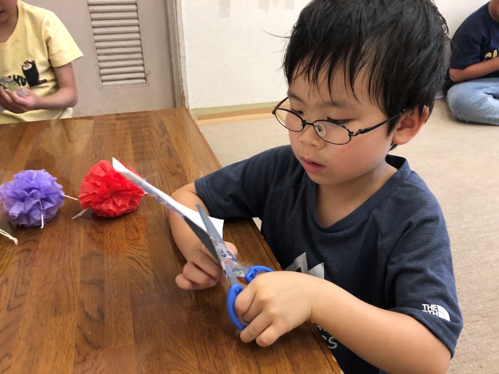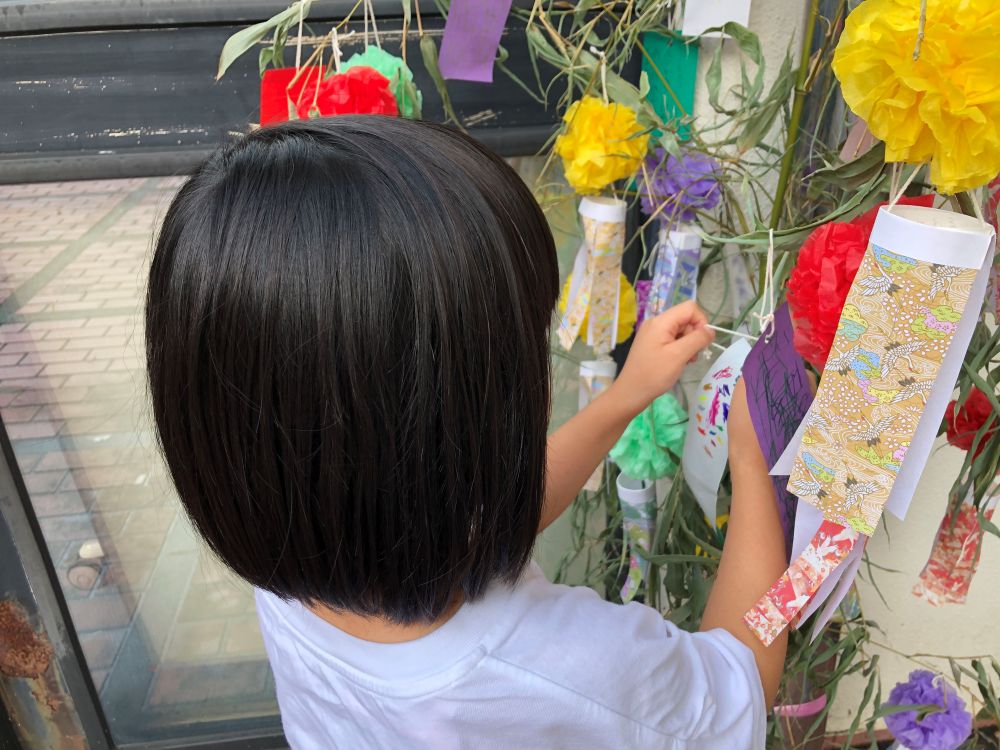 七夕制作では、好きな色の折り紙を子ども達に選んでもらいハサミで切り「吹き流し」を作りました。思い思いに作った吹き流しやみんなの願い事を大きな笹に飾り、七夕を楽しみました!