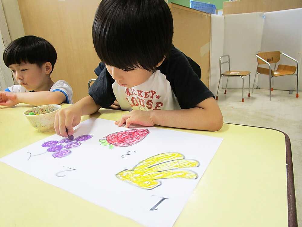 「これは何かな?」「バナナ!」塗る果物について子どもたちとお話をして塗り絵が始まりました。