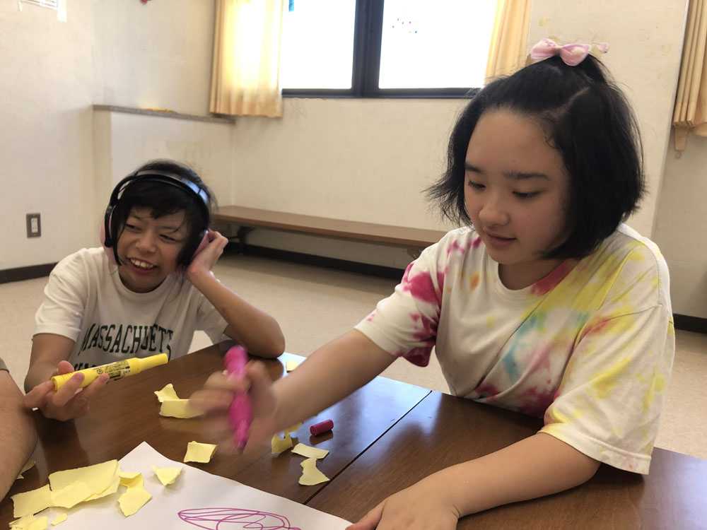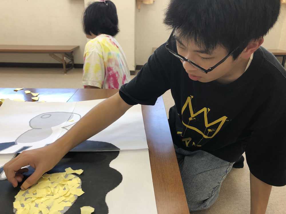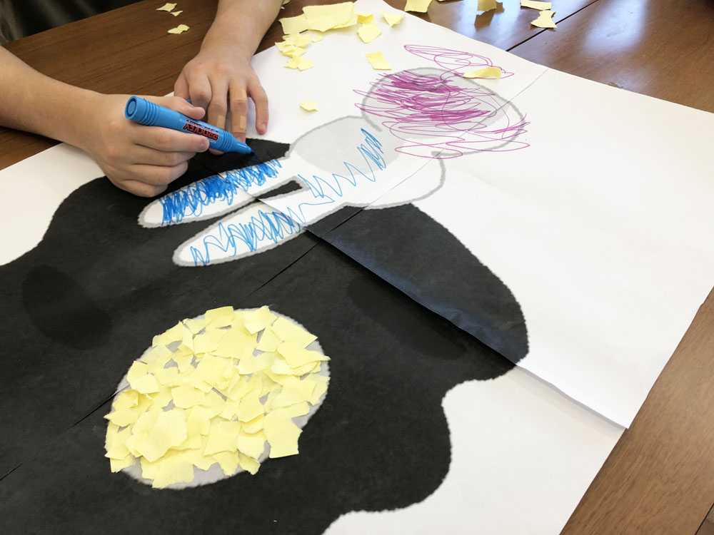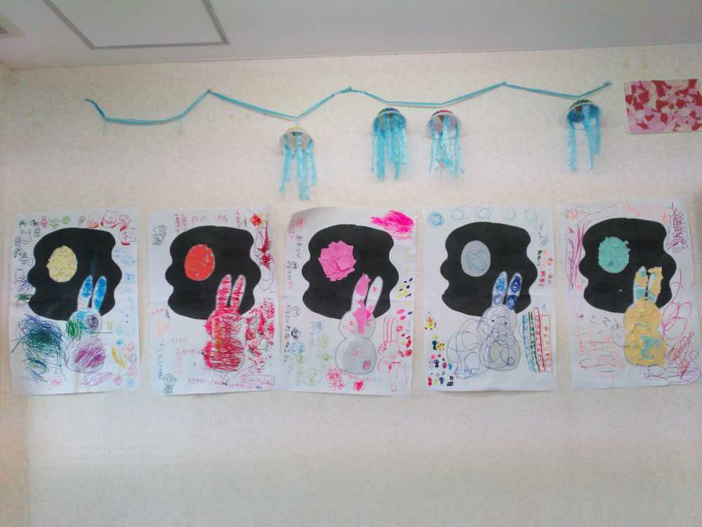 曜日ごとに大きな模造紙に描かれているうさぎとお月さまに、千切った紙やマジックなどで色をつけ、その周りにも個性あふれる絵が登場し1つの作品が完成!