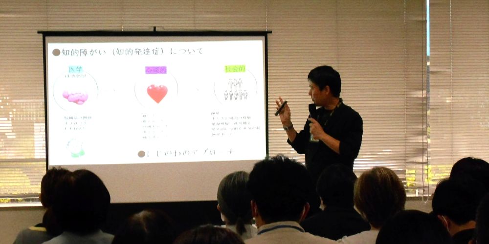 にじのわの紹介では、役割とこれまでの相談実績などの説明をし、「発達障がいの特徴と関わり方」では、発達障がいについてと支援に必要な視点、支援の仕方、氷山モデルなどのお話をさせていただきました。また、自閉症の方の見え方の体験をしています。質疑応答の時間もあり、事例を交えての質問もありました。