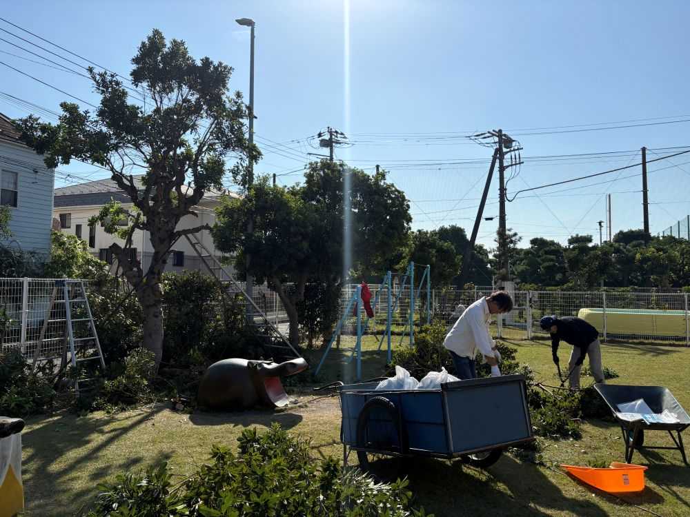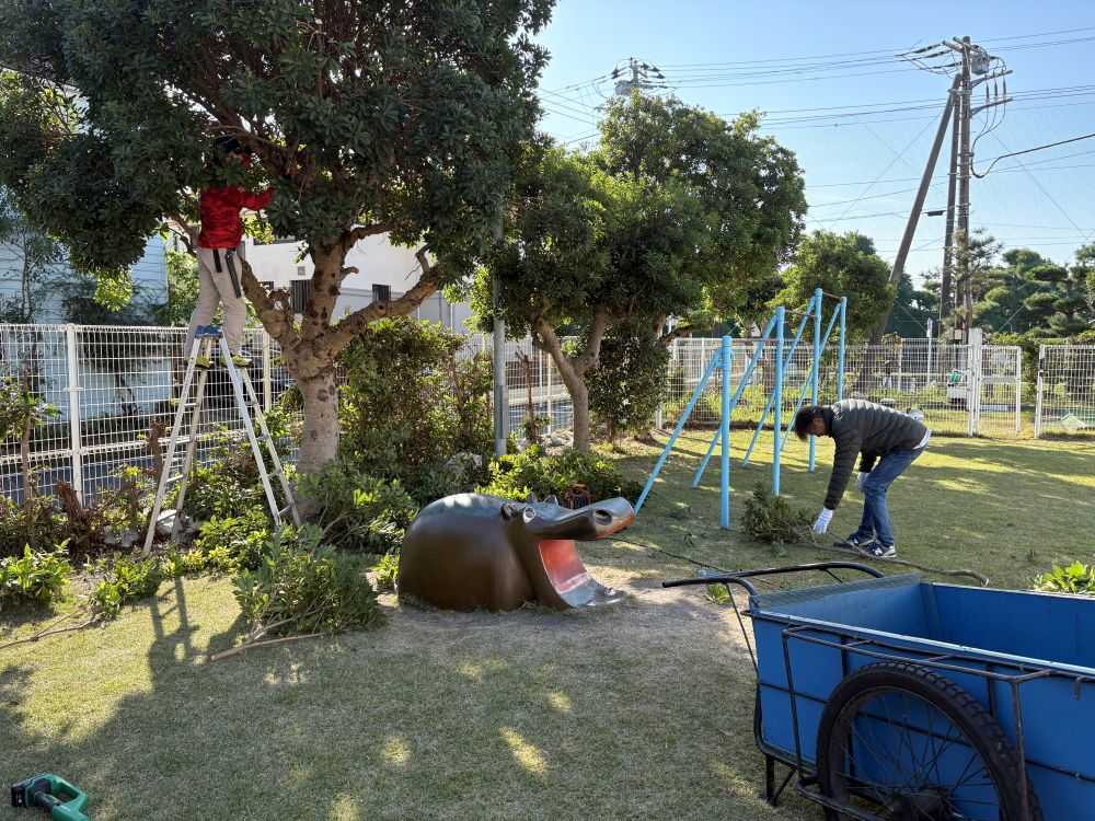 子どもたちが安全に、気持ちよく遊べるよう、園庭の環境も整えています。枝葉がすっきりしたことで、園庭に陽が多く入るようになりました。寒い冬、少しでも暖かい陽の下で元気に遊んでもらえたら嬉しいです。