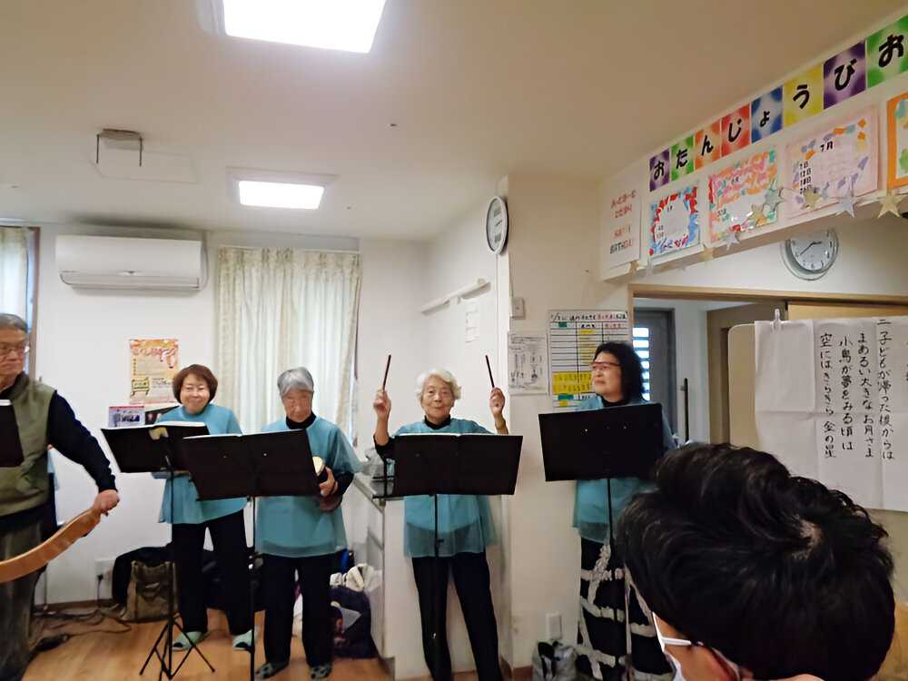 みんなで歌うや、途中には入居者の皆さんにハンドベル体験をしていただく場面もありました!