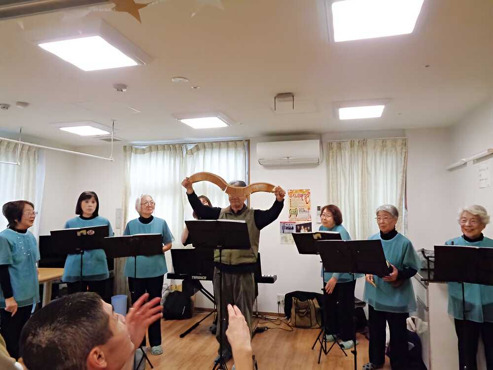 当初は恥ずかしさから声が出にくい様子も見られましたが、入居者さんが率先して歌い始めたことで徐々に声が広がり、後半には多くの方が楽しそうに歌っている様子が見られました。