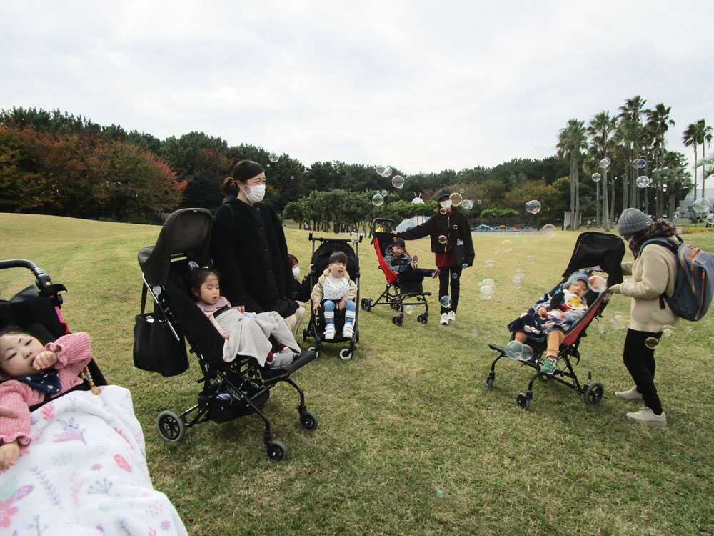 芝生広場でハンモックやパラバルーン、シャボン玉で、風を感じながら過ごしました。昼食は、季節の花が沢山咲いているベンチに座り、良い景色の中お腹いっぱいお弁当を食べました
