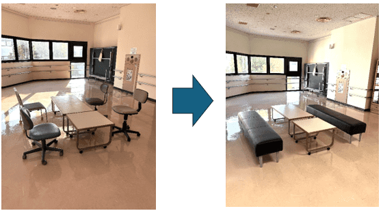 これまでの休憩スペースは椅子のサイズも仕様もバラバラで、雑然とした空間となっておりました。