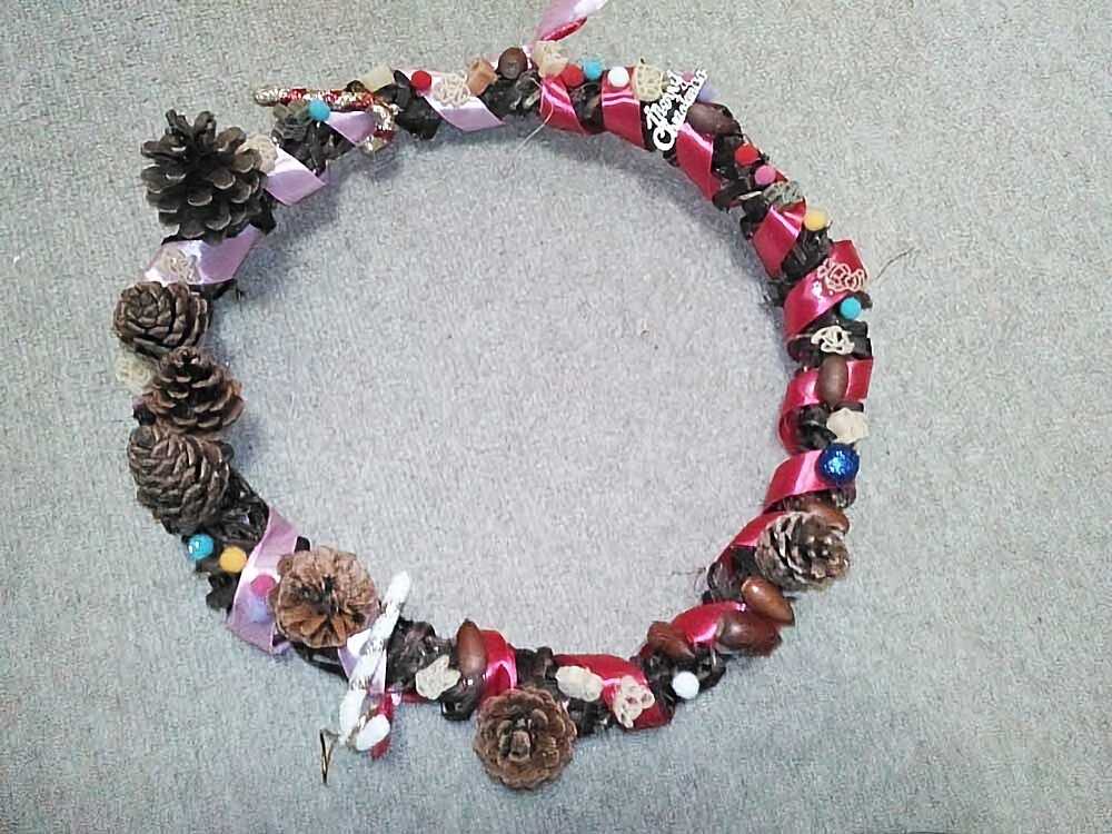 収穫を行った、さつま芋の蔓を使い子どもたちと散歩の際に拾って来た、松ぼっくりやどんぐり等を使い装飾をしました。