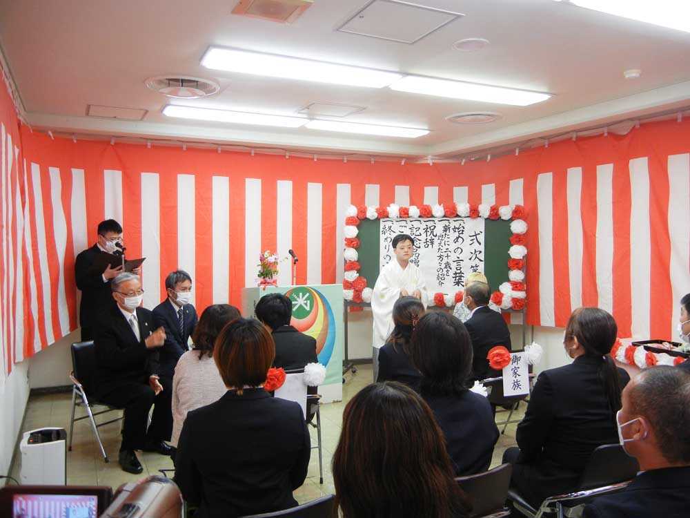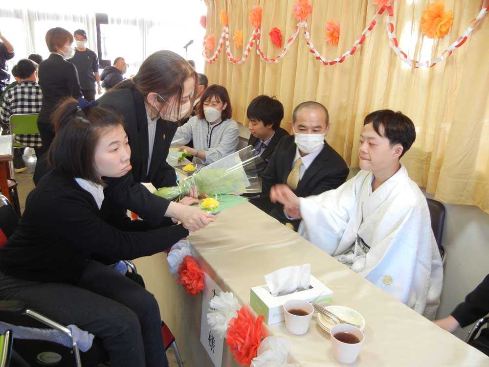 厳かな雰囲気の式典の後は、お祝い会を開き、利用者の皆さんも一緒にケーキを食べながらお祝いしました。