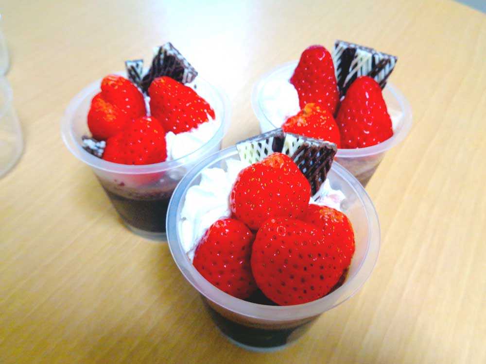 そして、もう一つはバレンタインデー❤ 今年は職員手作りのチョコレートムースにイチゴやチョコレートを乗せて、生クリームを絞りました。
