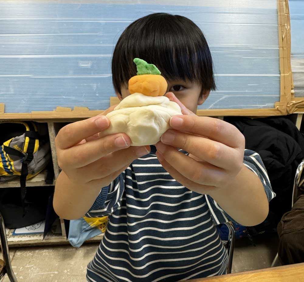 すみれ組では、小麦粉粘土で「鏡餅づくり」と制作で「福笑い」行いました。