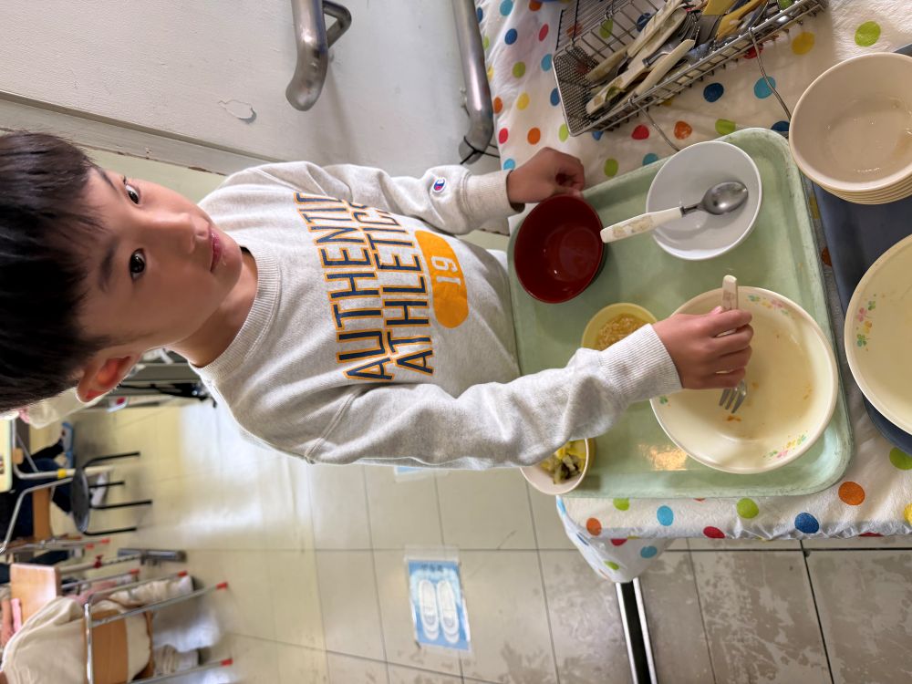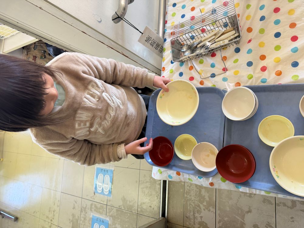 給食を食べ終わったら、自分たちで食器の片づけを行なっています。始めは1つずつ職員と行ない、今では自ら進んで片付けています。保護者の方から「食べた食器を片付けてくれるようになりました」と嬉しい報告がありました。これからもキャロットで身の回りのできることを増やしていきたいと思います。