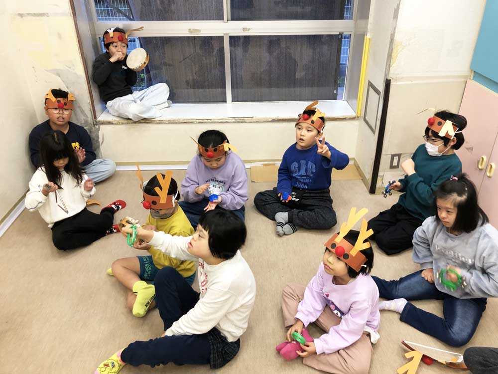クリスマス会では、歌に合わせて楽器を演奏して、クリスマスツリーを飾り付けるマッチングゲームをした後にサンタさんからプレゼントをもらい、子どもたちからは「やったー!」「早くお菓子を食べたいな~」等の声があがった充実した時間となりました。